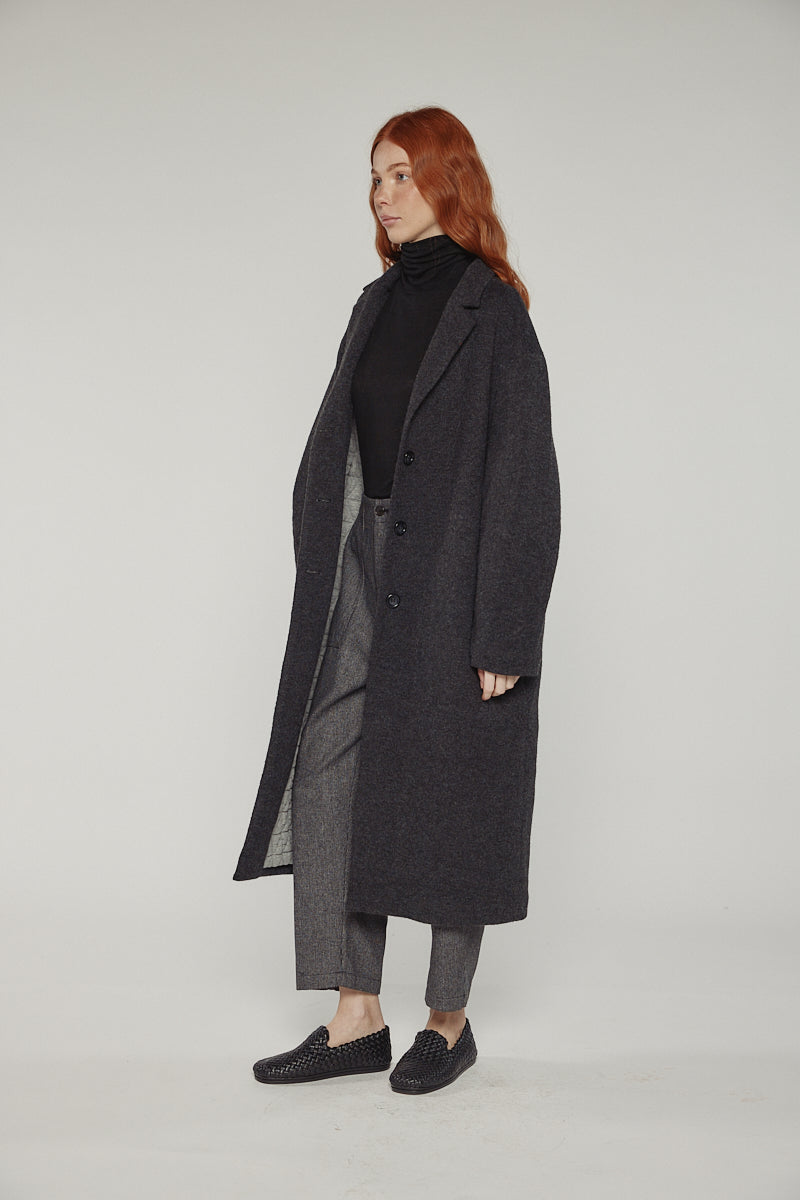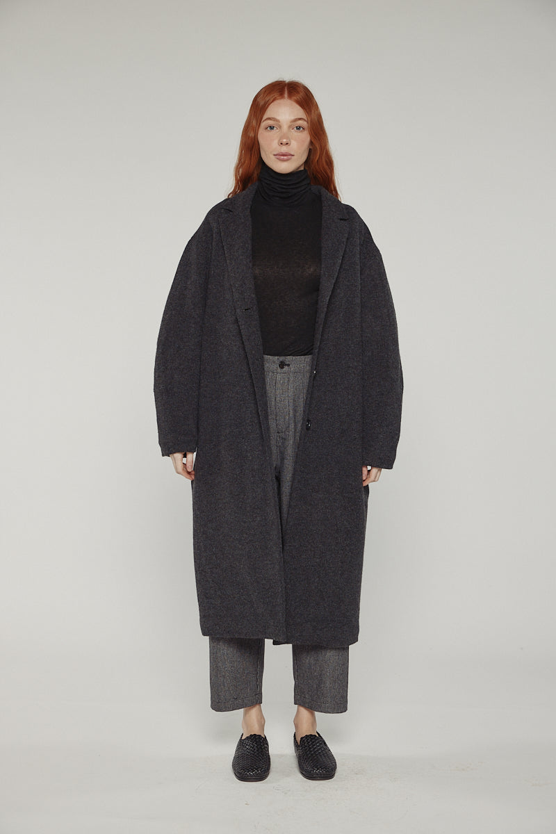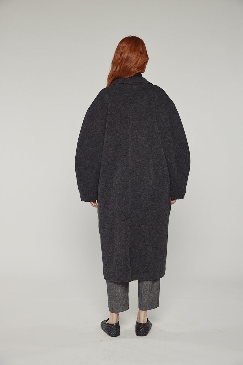 This maxi-length coat is crafted from a soft wool blend with a cocoon-sleeve design, creating gentle volume and modern proportions.
