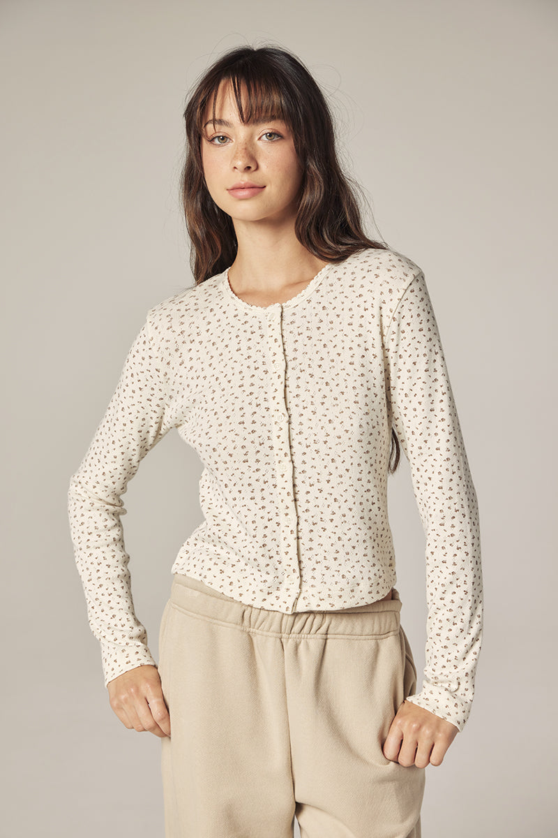 The Button Down Short Cardigan is crafted from a soft cotton with a subtle rib texture and gentle stretch, offering a comfortable, close-to-body fit.