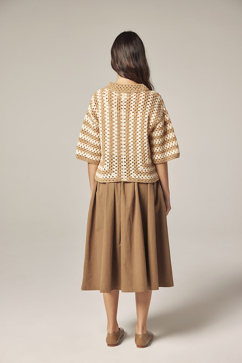 A softly structured crochet shirt, hand-knit in a breathable cotton blend.