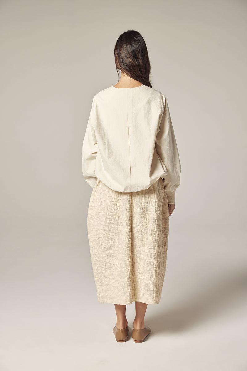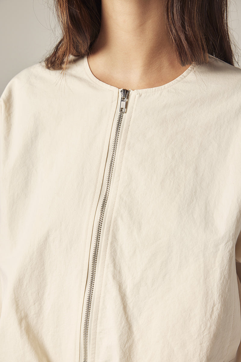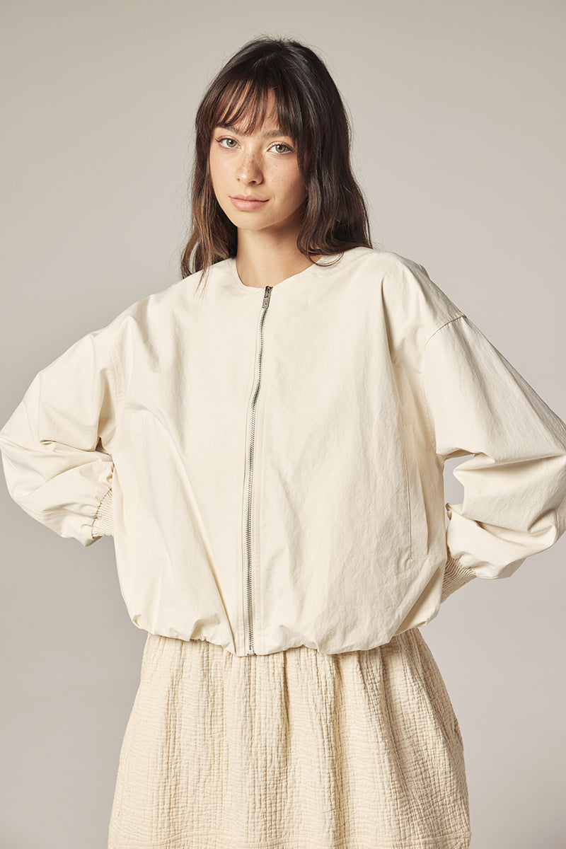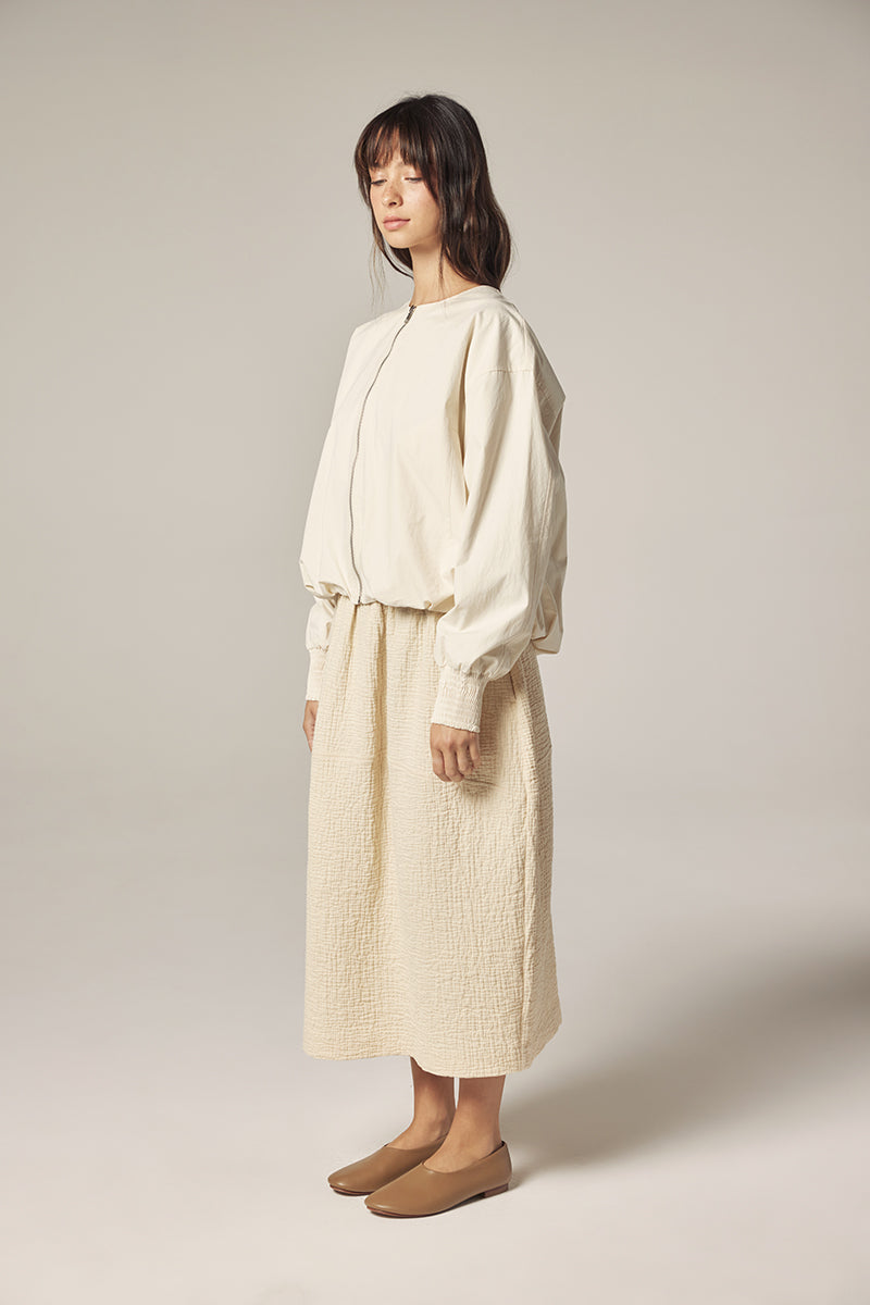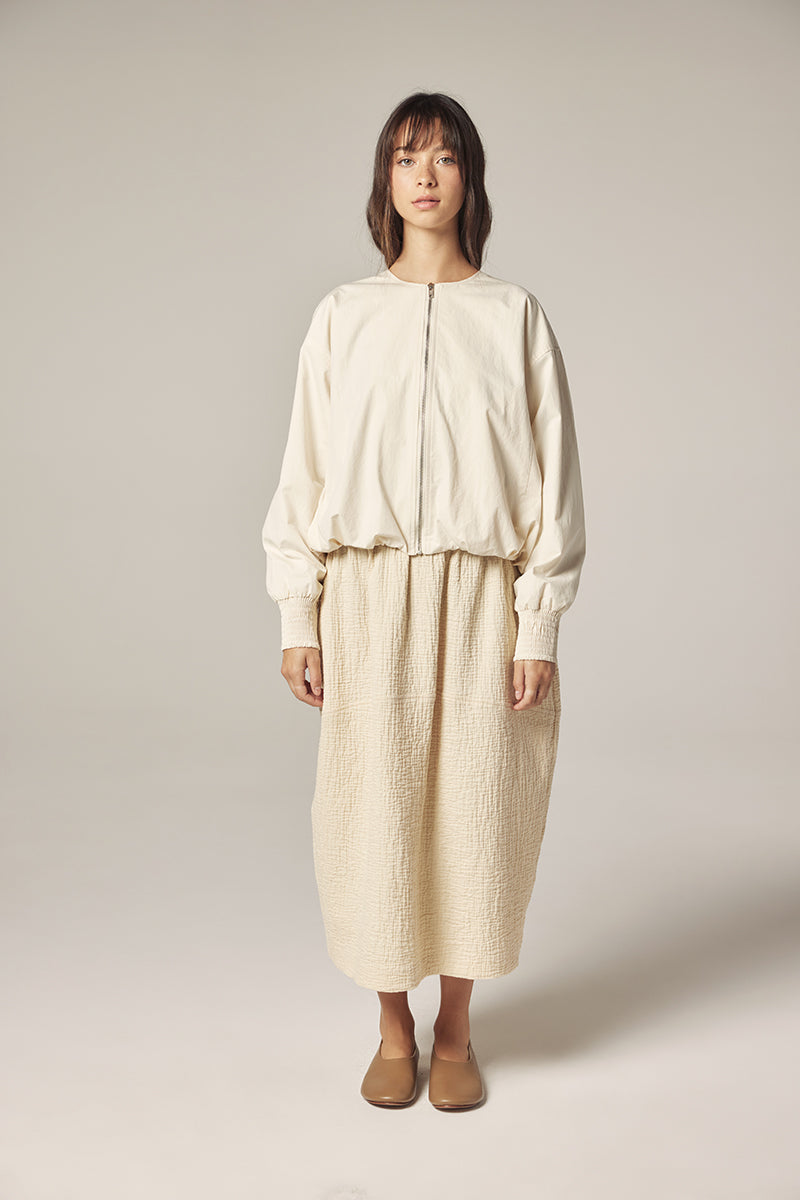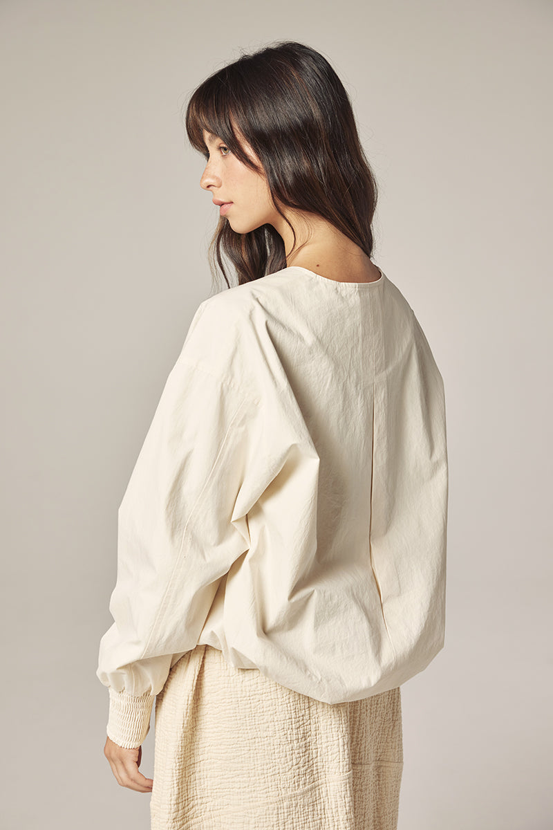 Subtle details—smocked cuffs, a clean front zipper, and softly gathered volume through the sleeves—bring quiet character to this everyday piece.