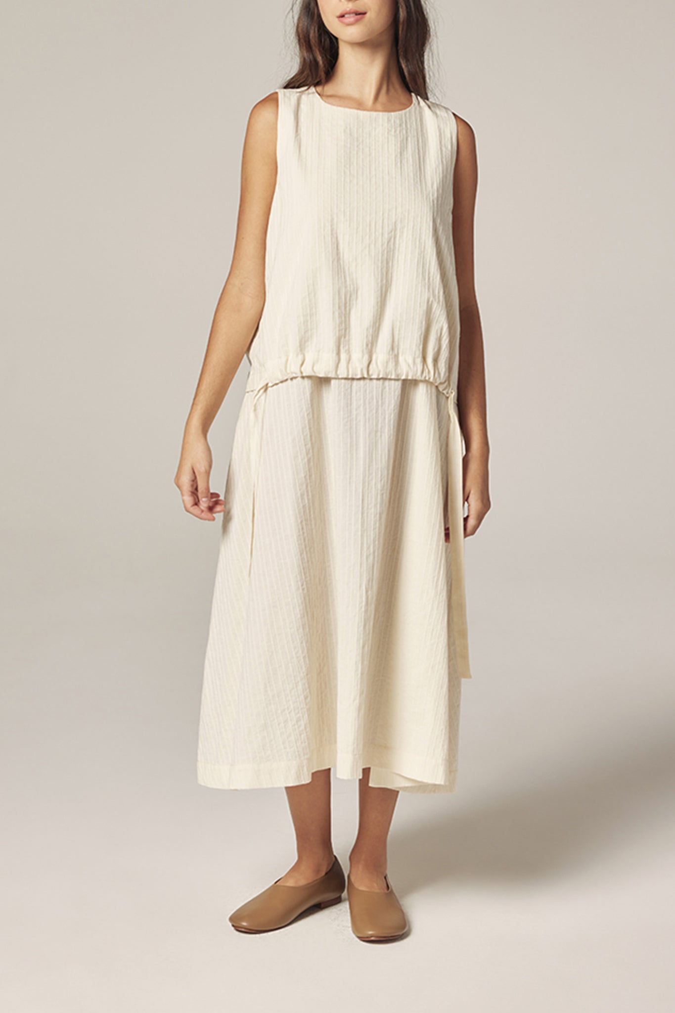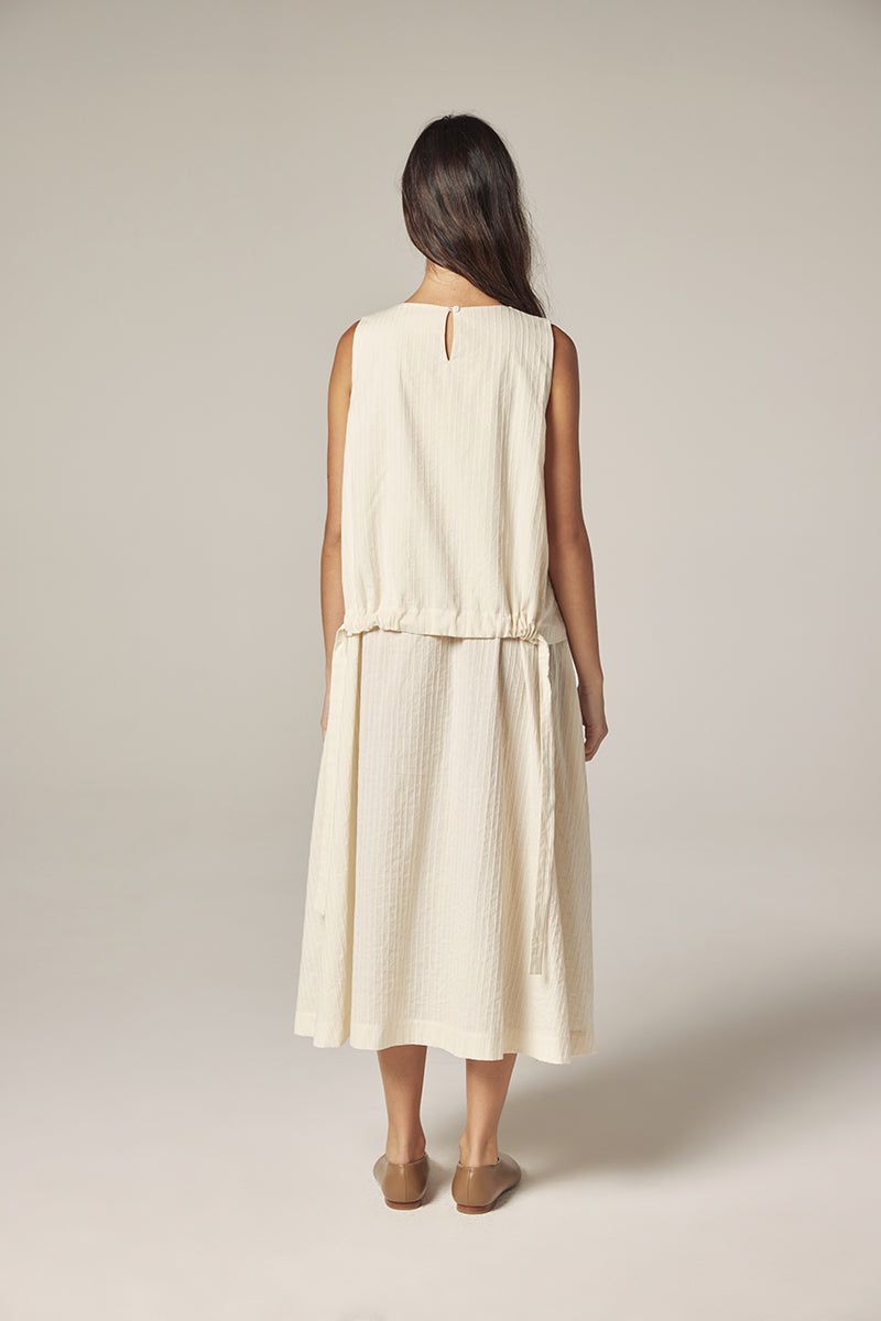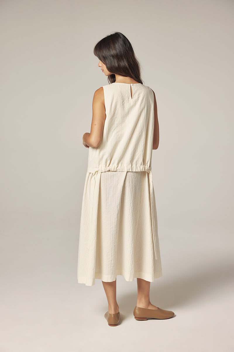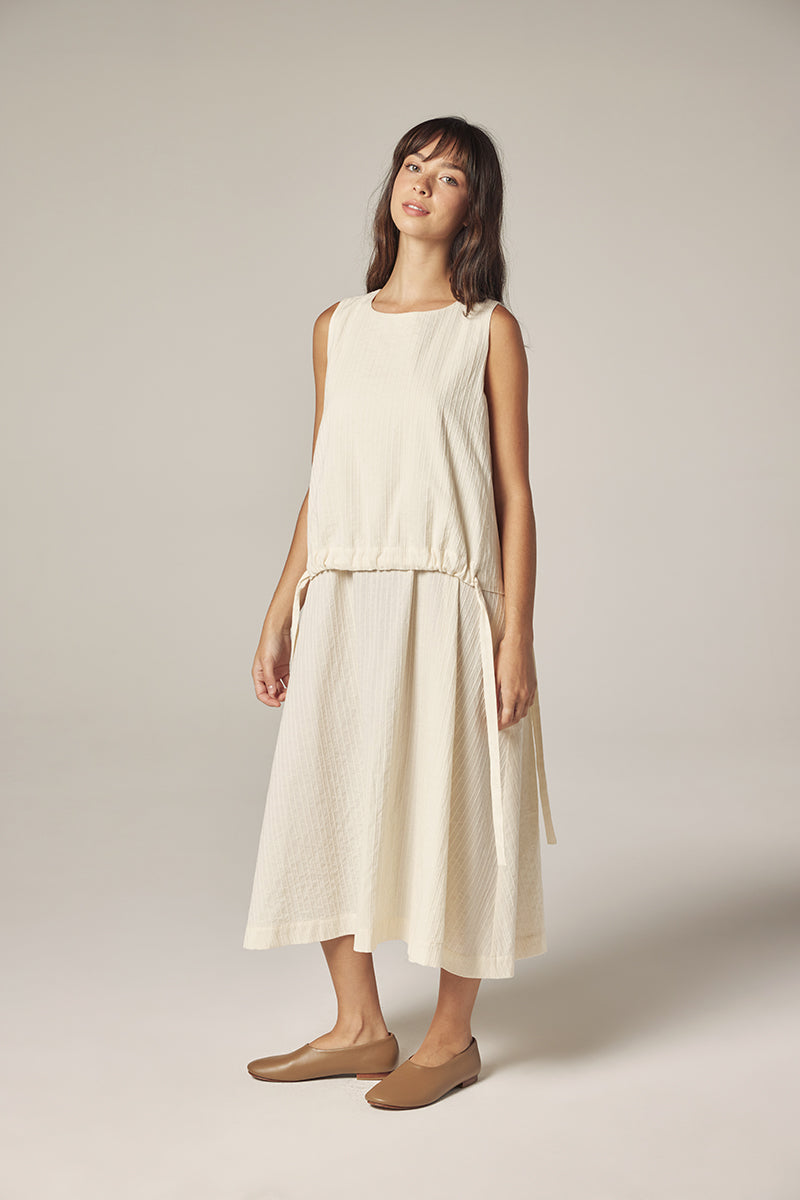 A softly structured midi dress crafted from breathable cotton with subtle vertical texture.