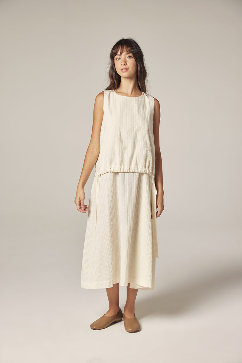The layered waist detail adds quiet dimension while the flowing midi skirt moves effortlessly with the body.